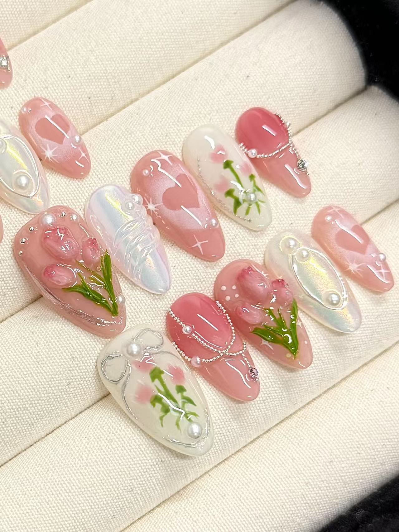 Our press-on nails are handmade using acrylic manicure tips and salon-grade gel. Designed with durability in mind and are reusable for multiple wears.